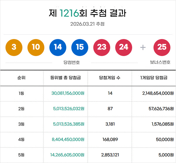 Á¦1216ȸ ·Î¶Çº¹±Ç Ãß÷¿¡¼­ ¡®3, 10, 14, 15, 23, 24¡¯°¡ 1µî ¹øÈ£·Î »ÌÇû´Ù. 2µî º¸³Ê½º ¹øÈ£´Â ¡®25¡¯´Ù.