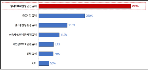 ±× ¿Ü ¡®±Ù·Î½Ã°£ ±ÔÁ¦¡¯¶ó´Â ÀÀ´äÀÌ 25.0%, ¡®Åº¼ÒÁ߸³ µî ȯ°æ ±ÔÁ¦¡¯¶ó´Â ÀÀ´äÀÌ 15.5% ¼øÀ¸·Î ³ªÅ¸³µ´Ù(º¹¼öÀÀ´ä). À̿ܿ¡µµ »ó»ó¼Ó¼¼¡¤¹ýÀμ¼ µî ¼¼Á¦ ±ÔÁ¦ ÀÀ´äÀº 11.2%, °³ÀÎÁ¤º¸º¸È£ °ü·Ã ±ÔÁ¦ 8.1%, »ó¹ý ±ÔÁ¦ 7.9%¿´´Ù.