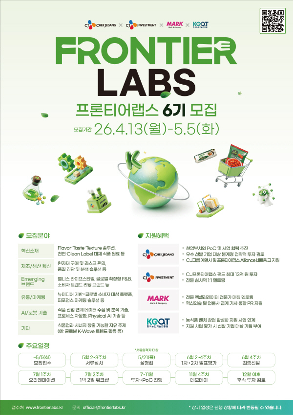 ½Äǰ°ú ¿¬°èµÈ ÀΰøÁö´É¡¤·Îº¿ ±â¼ú, Çѱ¹ À½½Ä ½Å»ý ºê·£µå, ½Äǰ À¯Å롤¸¶ÄÉÆÃ ±â¹Ý ¼­ºñ½º, ½º¸¶Æ® Á¦Á¶ Çõ½Å, ´ëü ½Äǰ ¹× ģȯ°æ ¼ÒÀç µîÀÇ ´Ù¾çÇÑ ºÐ¾ß¿¡¼­ °æÀï·ÂÀ» °®Ãá ±â¾÷À̶ó¸é Áö¿øÇÒ ¼ö ÀÖ´Ù. ȯ°æ¡¤»çȸ¡¤Åõ¸í °æ¿µ, ±âÈÄ ±â¼ú µî CJÁ¦ÀÏÁ¦´ç°ú Çù·Â È¿°ú¸¦ ³¾ ¼ö ÀÖ´Â ¾÷üµµ Âü¿©°¡ °¡´ÉÇÏ´Ù. ¿À´Â 5¿ù 5ÀϱîÁö ¿Â¶óÀÎÀ» ÅëÇØ ½Åû¼­¸¦ ³»¸é µÈ´Ù. ÀÚ¼¼ÇÑ ³»¿ëÀº ¡®³ó½Äǰ â¾÷Á¤º¸¸Á¡¯¿¡¼­ È®ÀÎÇÒ ¼ö ÀÖ´Ù.