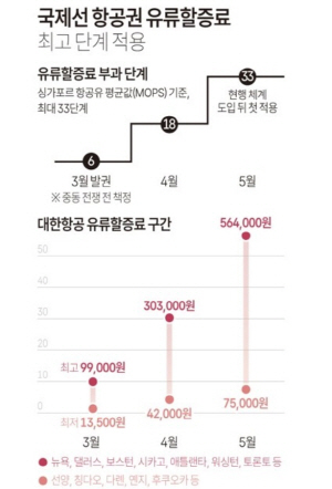 16ÀÏ Ç×°ø¾÷°è¿¡ µû¸£¸é 5¿ù À¯·ùÇÒÁõ·á ±âÁØÀÌ µÇ´Â 3¿ù 16ÀÏ¡­4¿ù 15ÀÏ ½Ì°¡Æ÷¸£ Ç×°øÀ¯ Æò±Õ°ª(MOPS)Àº 1°¶·±´ç 511.21¼¾Æ®(¹è·²´ç 214.71´Þ·¯)·Î Àû¿ë °¡´ÉÇÑ ÃÖ°í ´Ü°èÀÎ 33´Ü°è(°¶·±´ç 470¼¾Æ® ÀÌ»ó)¿¡ ÇØ´çÇÑ´Ù. À¯·ùÇÒÁõ·á´Â Ç×°ø»ç°¡ À¯°¡ »ó½Â¿¡ µû¸¥ ¼Õ½ÇÀ» º¸ÀüÇϱâ À§ÇØ ¿îÀÓ¿¡ Ãß°¡·Î ºÎ°úÇÏ´Â ±Ý¾×ÀÌ´Ù. ±¹Åä±³ÅëºÎ °Å¸®ºñ·ÊÁ¦¿¡ µû¶ó °¢ Ç×°ø»ç¿¡¼­ ÀÚü Á¶Á¤À» °ÅÃÄ ¿ùº°·Î Ã¥Á¤ÇÑ´Ù. À¯·ùÇÒÁõ·á´Â Ç×°ø±Ç ¹ß±ÇÀÏ ±âÁØÀ¸·Î ºÎ°úµÈ´Ù. Ç×°ø»ç´Â ¹ß±Ç ÀÌÈÄ À¯°¡°¡ ´õ ¿Ã¶ó À¯·ùÇÒÁõ·á°¡ ¿Ã¶óµµ Â÷¾×À» ¹ÞÁö ¾Ê°í, ¹Ý´ë·Î À¯·ùÇÒÁõ·á°¡ ³»·Áµµ Â÷¾×À» µ¹·ÁÁÖÁö ¾Ê´Â´Ù.