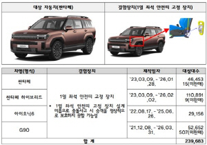 22ÀÏ ±¹Åä±³ÅëºÎ´Â Çö´ëÀÚµ¿Â÷¢ß, ±â¾Æ¢ß, KG¸ðºô¸®Æ¼¢ß, Çѱ¹Åä¿äŸÀÚµ¿Â÷¢ß ¿¡¼­ Á¦ÀÛ¡¤¼öÀÔ¡¤ÆÇ¸ÅÇÑ 17°³ Â÷Á¾ 53¸¸2144´ë¿¡¼­ Á¦ÀÛ °áÇÔÀÌ µå·¯³µ´Ù°í ¹àÇû´Ù. Çö´ëÀÚµ¿Â÷ÀÇ ½ÑŸÆä(ÇÏÀ̺긮µå Æ÷ÇÔ)¿Í ¾ÆÀÌ¿À´Ð6, Á¦³×½Ã½º G90 µî 4°³ Â÷Á¾ 23¸¸9683´ë´Â 1¿­ Á¼® ¾ÈÀü¶ì °íÁ¤ ÀåÄ¡ ¼³°è ¹ÌÈíÀ¸·Î Ãæµ¹ »ç°í¿¡¼­ ½Â°´À» Á¤»óÀûÀ¸·Î º¸È£ÇÏÁö ¸øÇÒ ¼ö ÀÖ´Ù´Â ÁöÀûÀ» ¹Þ¾Ò´Ù. ÀÌ´Â ¹Ì±¹¿¡¼­ 4°³ Â÷Á¾ 29¸¸4000´ë¸¦ ´ë»óÀ¸·Î ÁøÇàÇÏ´Â ±Û·Î¹ú ¸®Äݰú °°Àº ³»¿ëÀÌ´Ù. ȸ»ç ÃøÀº º¸°­ ºÎǰÀ» ½Å¼ÓÈ÷ »ý»êÇØ ½ÃÁ¤Á¶Ä¡¸¦ ÇÑ´Ù´Â ¹æÄ§À» Á¤Çß´Ù. ¶Ç Çö´ëÀÚµ¿Â÷ÀÇ ÀÏ·º½ÃƼ ÀÌÃþ¹ö½º 202´ë´Â Â÷ü ¼³°è ¹ÌÈí ¹®Á¦·Î Áß¹® »ó´ÜºÎ Â÷ü ±¸Á¶¹° ±Õ¿­ÀÌ ¹ß»ýÇØ ½ÃÁ¤Á¶Ä¡ ´ë»óÀÌ µÆ´Ù.