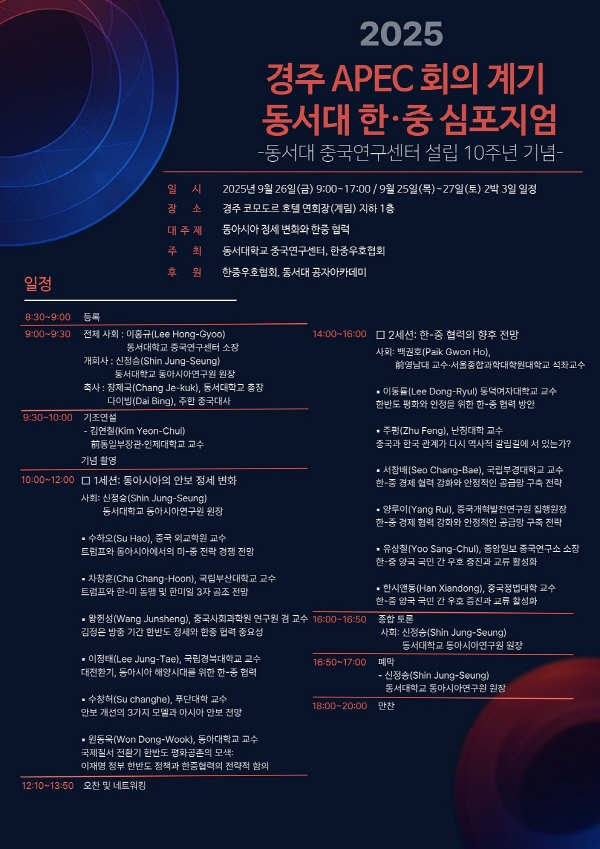 µ¿¼´ëÇб³(ÃÑÀå ÀåÁ¦±¹) Áß±¹¿¬±¸¼¾ÅͰ¡ ¼³¸³ 10ÁÖ³â ¹× °æÁÖ APEC °³ÃÖ¸¦ ¸Â¾Æ ÇÑ-Áß °ü°è °³¼±°ú Çù·ÂÀ» À§ÇØ ´ç´ë Áß±¹À» ´ëÇ¥ÇÏ´Â Àú¸íÇÑ ¿¬±¸ÀÚµé°ú Çѱ¹ ¿µ³²±ÇÀ» ´ëÇ¥ÇÏ´Â ÁÖ¿ä Áß±¹ ¿¬±¸ÀÚµéÀ» ÃÊûÇÏ¿© 9¿ù26ÀÏ °æÁÖ¿¡¼ ÇÑ-Áß ±¹Á¦½ÉÆ÷Áö¾öÀ» °³ÃÖÇÑ´Ù°í 25ÀÏ ¹àÇû´Ù.