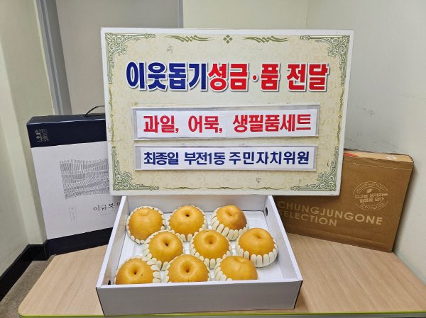 ÃÖÁ¾ÀÏ ºÎÀü1µ¿ ÁÖ¹ÎÀÚÄ¡À§¿øÈ¸ °¨»ç´Â 1ÀÏ ¹ÎÁ· ÃÖ´ëÀÇ ¸íÀý Ãß¼®À» ¸Â¾Æ °úÀÏ, ¾î¹¬, »ýÇÊǰ µîÀ¸·Î ±¸¼ºµÈ 20¸¸¿ø »ó´çÀÇ ¼±¹°¼¼Æ®¸¦ ºÎ»êÁø±¸ ºÎÀü1µ¿(µ¿Àå Çϱâ¼ö)¿¡ ±âŹÇß´Ù.