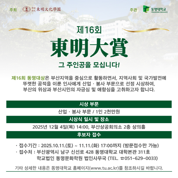 Çб³¹ýÀÎ µ¿¸í¹®ÈÇпø(ÀÌ»çÀå °°æ¼ö)°ú µ¿¸í´ëÇб³(ÃÑÀå ÀÌ»óõ)´Â 2025³â Á¦16ȸ µ¿¸í´ë»ó »ê¾÷¡¤ºÀ»ç ºÎ¹® Èĺ¸ÀÚ ÃßõÀ» ¿À´Â 11¿ù 11ÀÏ(È¿äÀÏ)±îÁö Á¢¼öÇÑ´Ù°í ¹àÇû´Ù. ¼ö»óÀÚ 1Àο¡°Ô´Â 2,000¸¸ ¿øÀÇ »ó±ÝÀÌ Áö±ÞµÈ´Ù.