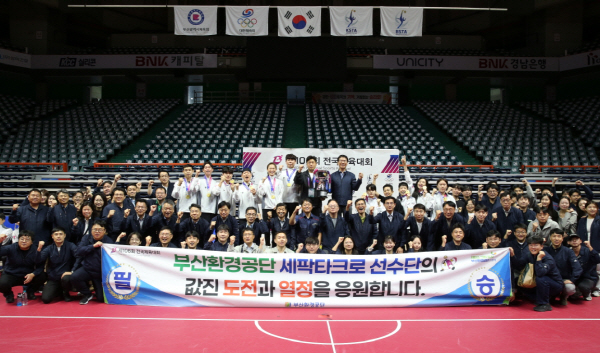 ºÎ»êȯ°æ°ø´ÜÀº Á÷¿ø 200¿©¸íÀÇ ÀÀ¿ø´ÜÀ» ±¸¼ºÇÏ¿© ´ÙÇÔ²² »çÁ÷½Ç³»Ã¼À°°üÀ» ã¾Æ ¿¶í ÀÀ¿øÀ» ÆîÃÆ´Ù. Á÷¿øµé°ú ÇÔ²² Á÷Á¢ °æ±âÀåÀ» ã¾Æ ¼±¼ö´ÜÀ» °Ý·ÁÇÑ À̱ÙÈñ ÀÌ»çÀåÀº¡°¼¼ÆÅŸũ·Î°¡ ¾ÆÁ÷ ºñÀαâ Á¾¸ñÀÌ´Ùº¸´Ï Àü¿ë ¿¬½ÀÀåÀÌ ¾ø¾î ÈÆ·Ã¿©°ÇÀÌ ÁÁÁö ¾Ê´Ù. ÀÌ·¯ÇÑ »óȲ ¼Ó¿¡¼µµ ¹¬¹¬È÷ ÈÆ·ÃÇÏ¿© ¿ì¼öÇÑ ¼ºÀûÀ» ³½ ¼±¼öµé¿¡°Ô °¨»ç¿Í °Ý·ÁÀÇ ¸»À» ÀüÇÏ°í ½Í´Ù.¡±°í ÀüÇß´Ù.