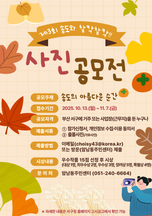 ºÎ»ê ¼±¸ ¾Ï³²µ¿ ÁÖ¹ÎÀÚġȸ(À§¿øÀå ±èÁ¾ÅÂ)¿Í »õ¸¶À»¹®°íȸ(ȸÀå À±Á¾¹Î)´Â Áö¿ª ÁֹεéÀ» ´ë»óÀ¸·Î ¡°Á¦3ȸ ¼Ûµµ¿Í ÂûĬÂûĬ!! »çÁø °ø¸ðÀü¡±À» °³ÃÖÇÑ´Ù°í ¹àÇû´Ù.