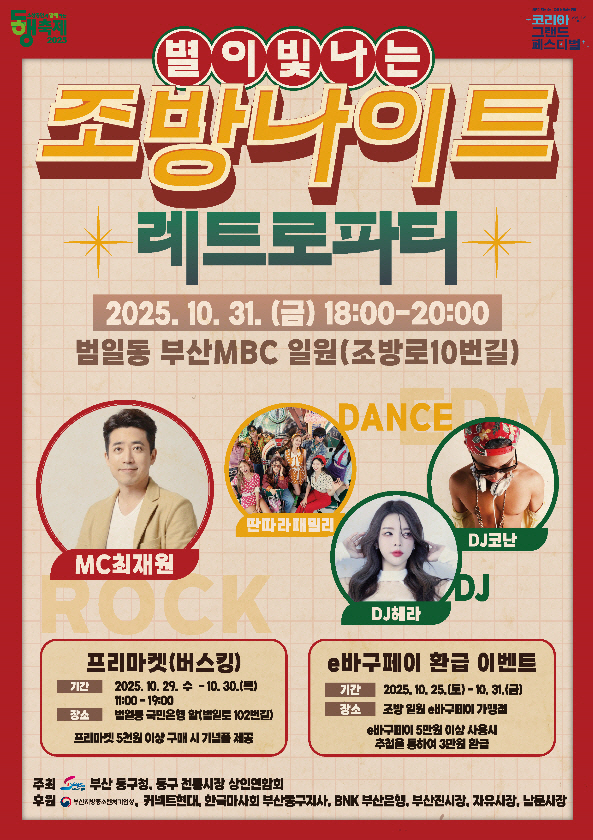 ºÎ»ê µ¿±¸´Â Á¶¹æÀÇ ¿¾ ¸í¼ºÀ» µÇ»ì¸®±â À§ÇÑ ÀÏȯÀ¸·Î 1970~80³â´ëÀÇ È·ÁÇß´ø Ãß¾ïÀÇ °Å¸®¸¦ ÀçÇöÇÏ´Â ÃàÁ¦ÀÎ ¡®º°ÀÌ ºû³ª´Â Á¶¹æ³ªÀÌÆ®(·¹Æ®·Î ÆÄƼ)¡¯ ¸¦ ¿À´Â 10¿ù 31ÀÏ ¿ÀÈÄ 6½Ã, ¹üÀϵ¿ ºÎ»êMBC ¿· ¾ß¿Ü ¹«´ë¿¡¼ °³ÃÖÇÑ´Ù°í ¹àÇû´Ù.