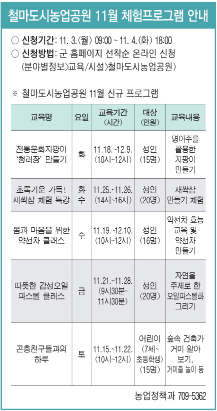 11¿ù °³¼³µÇ´Â ÁÖ¿ä ÇÁ·Î±×·¥À¸·Î ¡ã°ïÃæ Ä£±¸µé°úÀÇ ÇÏ·ç ¡ã¾à¼±Â÷ Ŭ·¡½º ¡ãÀüÅë¹®ÈÁöÆÎÀÌ¡®Ã»·ÁÀ塯¸¸µé±â ¡ã»õ½Ï»ï üÇè ¡ãµû¶æÇÑ °¨¼º ¿ÀÀÏÆÄ½ºÅÚ Å¬·¡½º µîÀÌ ¸¶·ÃµÆ´Ù.