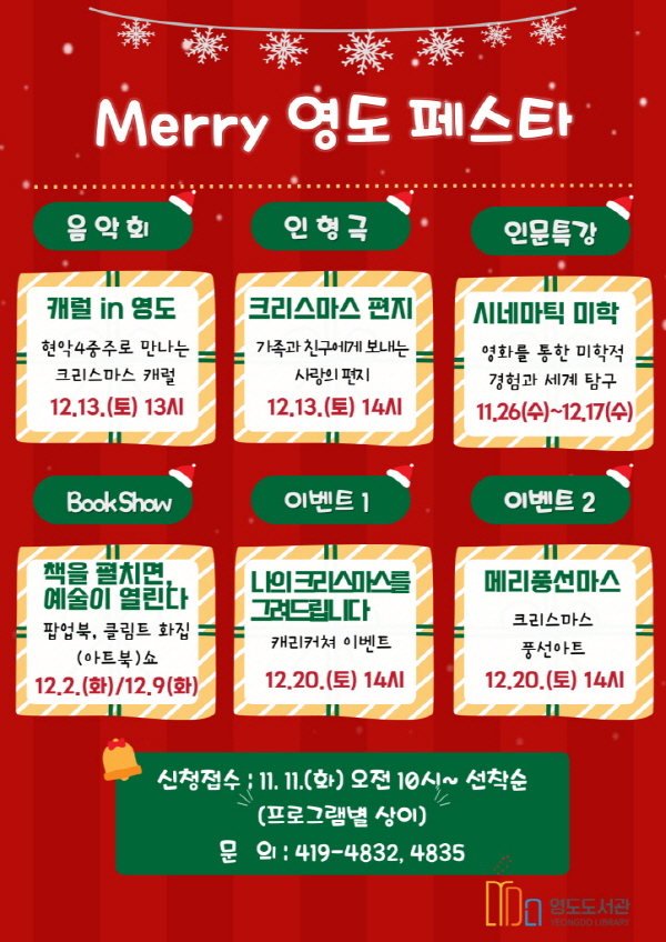ÇÑÆí, Merry ¿µµµ Æä½ºÅ¸´Â ¿À´Â 11¿ù 11ÀÏ(È)ºÎÅÍ ¿µµµµµ¼°ü ´©¸®Áý(https://www.yeongdo.go.kr/library.web)À» ÅëÇØ ½Åû °¡´ÉÇϸç, ÀÚ¼¼ÇÑ Á¤º¸´Â ¿µµµµµ¼°ü ´©¸®Áý ¶Ç´Â ÀüÈ(051-419-4832, 4835)·Î È®ÀÎÇÒ ¼ö ÀÖ´Ù.