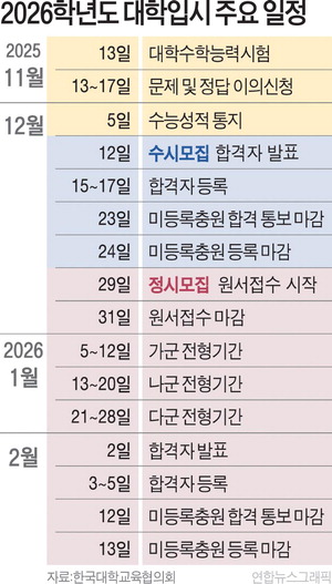 ¾Õ¼ ÀϺΠ´ëÇÐÀº ¼ö´É Àü ³í¼ú°í»ç¸¦ ÁøÇàÇϱ⵵ ÇßÁö¸¸, ´ëºÎºÐÀÇ ÁÖ¿ä ´ëÇÐÀº ¼ö´É ÀÌÆ² ÈÄÀÎ 15ÀϺÎÅÍ ³í¼ú¡¤¸éÁ¢°í»ç¸¦ ½ÃÀÛÇÑ´Ù. ÀÚ¼¼ÇÑ ´ëÇк° °í»ç ÀÏÁ¤Àº °¢ ´ëÇÐ ÀÔÇÐó ȨÆäÀÌÁö¿¡¼ È®ÀÎÇÒ ¼ö ÀÖ´Ù. ¼ö½Ã ÇÕ°ÝÀÚ´Â ´ÙÀ½ ´Þ 12ÀϱîÁö ¹ßÇ¥µÈ´Ù. Á¤½Ã¸ðÁý ¿ø¼ Á¢¼ö´Â ´ÙÀ½ ´Þ 29ÀϺÎÅÍ 31ÀϱîÁö´Ù. ÀüÇü ±â°£Àº ³»³â 1¿ù 5~28ÀÏÀÌ´Ù. ÇÕ°ÝÀÚ ¹ßÇ¥ÀÏÀº ³»³â 2¿ù 2ÀϱîÁö¸ç µî·Ï ±â°£Àº ³»³â 2¿ù 3~5ÀÏÀÌ´Ù.
