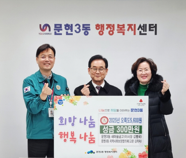 ºÎ»ê ³²±¸ ¹®Çö3µ¿ »õ¸¶À»±Ý°í ±èº´±¹ ÀÌ»çÀå°ú ±è¹Ì¼÷ ¹®Çö3µ¿ Áö¿ª»çȸº¸ÀåÇùÀÇü À§¿øÀº 12¿ù 10ÀÏ(¼ö) ¹®Çö3µ¿ ÇàÁ¤º¹Áö¼¾ÅÍ(µ¿Àå À±Á¾¼·)¸¦ ¹æ¹®ÇØ ¿ÃÇØµµ ¼º±Ý 300¸¸ ¿øÀ» ±âºÎÇß´Ù.