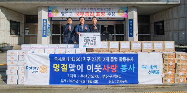 ºÎ»ê±¸´ö·ÎŸ¸®Å¬·´(ȸÀå ¹ÚÀ±¼ö)Àº Áö³ 12¿ù 16ÀÏ ¿µµµ±¸¸¦ ¹æ¹®ÇØ, ´Ù°¡¿À´Â ¼³ ¸íÀýÀ» ¾ÕµÎ°í ¾î·Á¿î ÀÌ¿ôµéÀÌ º¸´Ù µû¶æÇÏ°í ¾ÈÁ¤µÈ ¸íÀýÀ» º¸³¾ ¼ö ÀÖµµ·Ï ±èÄ¡(5kg) 20¹Ú½º¿Í ¶ó¸é 20¹Ú½º µî ÃÑ 90¸¸ ¿ø »ó´çÀÇ ¼ºÇ°À» ¹Ì¸® ±âŹÇß´Ù.
