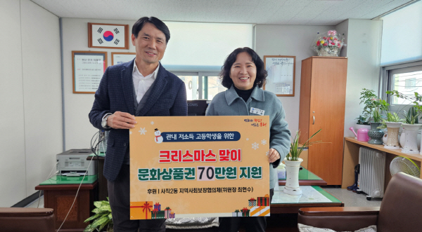 Áö³ÇØ Å©¸®½º¸¶½º¸¦ ¸Â¾Æ Àú¼Òµæ °íµîÇлý 10¸í¿¡°Ô 50¸¸ ¿ø »ó´çÀÇ ¹®È»óǰ±ÇÀ» Àü´ÞÇÑ µ¥ À̾î, ¿ÃÇØ´Â Áö¿ø ´ë»óÀ» È®´ëÇØ Àú¼Òµæ Ư¼ºÈ°íµîÇб³ ÀçÇлý µî 14¸í¿¡°Ô 70¸¸ ¿ø »ó´çÀÇ ¹®È»óǰ±ÇÀ» Áö¿øÇß´Ù.