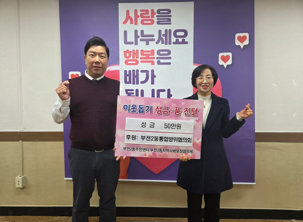 ºÎ»êÁø±¸ ºÎÀü2µ¿ ÅëÇÕ¹æÀ§ÇùÀÇȸ(ȸÀå ÀÌÁ¾¿µ)´Â Áö³ 24ÀÏ Ãë¾à°èÃþÀ» À§ÇÑ ÀÌ¿ôµ½±â ¼º±Ý 50¸¸ ¿øÀ» ºÎÀü2µ¿(µ¿Àå À̺οµ)¿¡ ±âŹÇß´Ù.