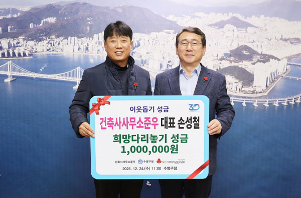 ºÎ»ê±¤¿ª½Ã ¼ö¿µ±¸(±¸Ã»Àå °­¼ºÅÂ)´Â 2025³â 12¿ù 24ÀÏ(¼ö)±¸Ã»Àå½Ç¿¡¼­ °ÇÃà»ç»ç¹«¼Ò ÁØ¿ì(´ëÇ¥ ¼Õ¼ºÃ¶)·ÎºÎÅÍ ³ª´®¹®È­ È®»ê µ¿Âü¿¡ ±â¿©ÇϰíÀÚ °ü³» Àú¼Òµæ ÁֹΠÁö¿øÀ» À§ÇÑ ¼º±Ý 100¸¸¿øÀ» Àü´Þ¹Þ¾Ò´Ù.