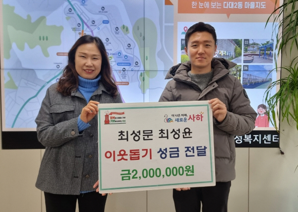 ºÎ»ê »çÇϱ¸ ´Ù´ë2µ¿¿¡ °ÅÁÖÇÏ´Â ÃÖ¼º¹®¡¤ÃÖ¼ºÀ± ÇüÁ¦´Â Áö³ 12¿ù31ÀÏ Áö¿ª ³» ¾î·Á¿î ÀÌ¿ôÀ» µ½±â À§ÇÑ ¼º±Ý 200¸¸ ¿øÀ» ´Ù´ë2µ¿ ÇàÁ¤º¹Áö¼¾ÅÍ¿¡ ±âŹÇϸç Áö¿ª»çȸ¿¡ ÀÜÀÜÇÑ ¿Â±â¸¦ ÀüÇß´Ù.