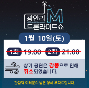 ºÎ»ê±¤¿ª½Ã ¼ö¿µ±¸(±¸Ã»Àå °¼ºÅÂ)´Â ¸ÅÁÖ Åä¿äÀÏ ±¤¾È¸® ÇØº¯¿¡¼ °³ÃֵǴ ¡¸±¤¾È¸® M µå·Ð¶óÀÌÆ®¼î¡¹ 1¿ù 10ÀÏ(Åä) °ø¿¬À» °Ç³ ¿¹º¸·Î Ãë¼ÒÇÑ´Ù°í ¹àÇû´Ù.