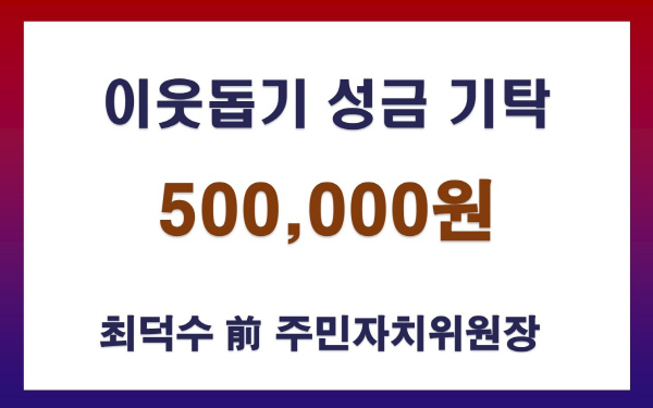 Á¤Á¤¶õ µ¿ÀåÀº ¡°ÁÖº¯ÀÇ ¾î·Á¿î ÀÌ¿ôÀ» ÀØÁö ¾Ê°í ÇѰᰰÀº ¸¶À½À» ÀüÇØÁּż Áø½ÉÀ¸·Î °¨»çµå¸®¸ç, ±âÅ¹ÇØ Áֽмº±ÝÀº µû¶æÇÑ ¸¶À½À» ´ã¾Æ ÁÖº¯ÀÇ ¾î·Á¿î ÀÌ¿ôµé¿¡°Ô Àß Àü´ÞÇϰڴ١±°í ¸»Çß´Ù. À̳¯ ±âŹµÈ ¼º±ÝÀº »çȸº¹Áö °øµ¿¸ð±Ýȸ¸¦ ÅëÇØ ÀüÆ÷1µ¿ Àú¼ÒµæÁֹο¡°Ô Àü´ÞµÉ ¿¹Á¤ÀÌ´Ù.