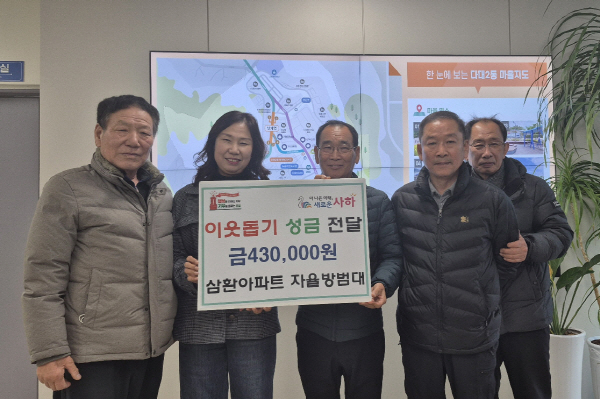 ºÎ»ê »çÇϱ¸ ´Ù´ë2µ¿ »ïȯ¾ÆÆÄÆ® ÀÚÀ²¹æ¹ü´ë´Â Áö³ 16ÀÏ Áö¿ª ³» ¾î·Á¿î ÀÌ¿ôÀ» µ½±â À§ÇÑ ¼º±Ý 43¸¸ ¿øÀ» ´Ù´ë2µ¿ ÇàÁ¤º¹Áö¼¾ÅÍ¿¡ ±âŹÇÏ¸ç µû¶æÇÑ ³ª´®À» ½ÇõÇß´Ù.