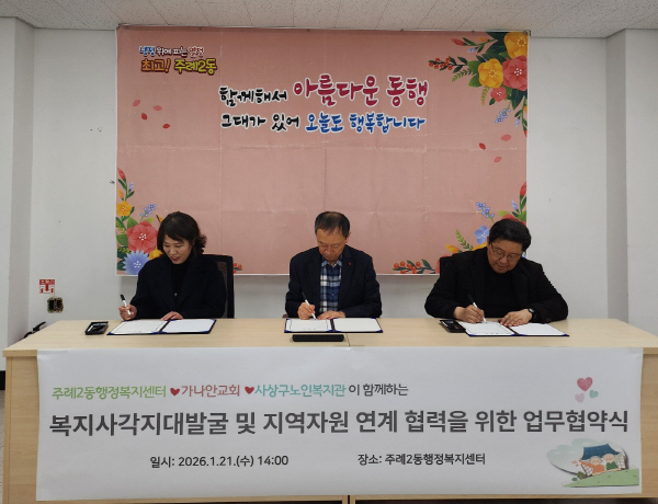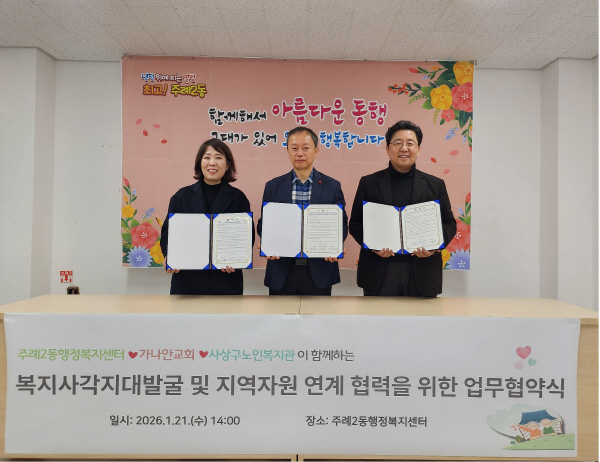 »ç»ó±¸ ÁÖ·Ê2µ¿(µ¿Àå ±è¿µ¹Î)Àº Áö³ 21ÀÏ °¡³ª¾È±³È¸¿Í »ç»ó±¸³ëÀκ¹Áö°ü°ú º¹Áö»ç°¢Áö´ë ¹ß±¼ ¹× Áö¿ªº¹ÁöÀÚ¿ø ¿¬°è¡¤Çù·Â ü°è ±¸ÃàÀ» À§ÇÑ ¾÷¹«Çù¾à(MOU)À» ü°áÇß´Ù°í ¹àÇû´Ù.