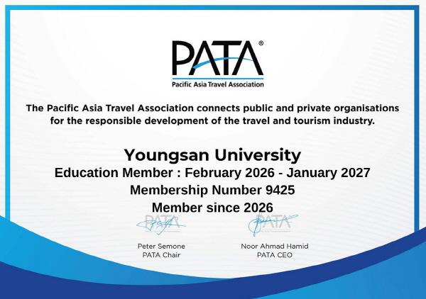 ¿ÍÀÌÁîÀ¯ ¿µ»ê´ëÇб³(ÃÑÀå ºÎ±¸¿í)°¡ ¼¼°è ÃÖ´ë ºñ¿µ¸® °ü±¤ ±â±¸ÀÎ ¡®ÅÂÆò¾çÁö¿ª°ü±¤Çùȸ(PATA)¡¯ÀÇ ½Å±Ô ȸ¿øÀ¸·Î °¡ÀÔÇϸç ÀçÇлýµéÀ» À§ÇÑ ±Û·Î¹ú ÀÎÅϽʰú ±¹Á¦ ÄÁÆÛ·±½º Âü¿© µî ¼¼°è ¹«´ë·Î ÅëÇÏ´Â ¡®°ñµç ƼÄÏ¡¯À» °Å¸ÓÁã¾ú´Ù. ±¹³» ´ëÇÐÀ¸·Î¼´Â °æÈñ´ë¿¡ À̾î 2¹øÂ°À̸ç, ºñ¼öµµ±Ç ´ëÇÐ Áß¿¡¼´Â ¿µ»ê´ë°¡ À¯ÀÏÇÏ´Ù.