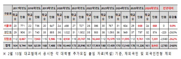 22ÀÏ ±³À°°è¿¡ µû¸£¸é ¿À´Â 27ÀϱîÁö 2026Çг⵵ ´ëÀÔ ¼ö½Ã¡¤Á¤½Ã ¹Ì¼±¹ß ÀοøÀÇ Ãß°¡¸ðÁýÀÌ ´ëÇк°·Î ÁøÇà ÁßÀÌ´Ù. Á¾·ÎÇпøÀÌ Çѱ¹´ëÇб³À°ÇùÀÇȸ(´ë±³Çù) ÀڷḦ ÅëÇØ Àü±¹ 17°³ ½Ã¡¤µµÀÇ ´ëÇк° Ãß°¡¸ðÁýÀ» ºÐ¼®ÇÑ °á°ú, ºÎ»ê µî 14°³ ½Ã¡¤µµÀÇ Ãß°¡¸ðÁý ÀοøÀº 7201¸íÀ¸·Î 7³â ¸¸¿¡ ÃÖÀúÄ¡¸¦ ±â·ÏÇÑ °ÍÀ¸·Î ³ªÅ¸³µ´Ù. ºÎ»êÁö¿ª ´ëÇÐÀº 2024Çг⵵ 1569¸í, 2025Çг⵵ 923¸í, 2026Çг⵵ 592¸í µîÀ¸·Î ÃÖ±Ù 3³â »çÀÌ °è¼Ó ÁÙ°í ÀÖ´Ù. °æ±â¡¤ÀÎõµµ 574¸íÀ¸·Î 10³â »çÀÌ ÃÖÀúÄ¡¸¦ ±â·ÏÇß´Ù. ¼¿ïÀº 668¸íÀ¸·Î Áö³ÇØ¿Í °°¾Ò°í, ¿¹³â°ú ºñ½ÁÇÑ ÃßÀ̸¦ º¸¿´´Ù.