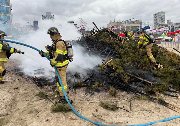 Áö³­ 1ÀÏ ¿ï»ê µ¿±¸ ÀÏ»êÇØ¼ö¿åÀå¿¡ Á¤¿ù´ëº¸¸§ Çà»ç¸¦ À§ÇØ ¼³Ä¡ÇØ µÐ ´ÞÁý ´õ¹Ì¿¡ ºÒÀÌ ³ª ¼Ò¹æ´ë¿øµéÀÌ ÁøÈ­ÀÛ¾÷À» Çϰí ÀÖ´Ù. °æÂûÀº ¹æÈ­ ¿©ºÎ¸¦ Á¶»ç ÁßÀÌ´Ù. ¿ï»ê¼Ò¹æº»ºÎ Á¦°ø