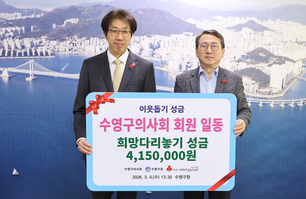 ºÎ»ê±¤¿ª½Ã ¼ö¿µ±¸(±¸Ã»Àå °­¼ºÅÂ)´Â 4ÀÏ(¼ö)±¸Ã»Àå½Ç¿¡¼­ ¼ö¿µ±¸ Èñ¸Á´Ù¸®³õ±â»ç¾÷ÀÇ ÀÏȯÀ¸·Î ¼ö¿µ±¸ ÀÇ»çȸ(ȸÀå ±èº¸¼®)·ÎºÎÅÍ Àú¼Òµæ Ãë¾à °èÃþ ¼¼´ë¸¦ ´ë»óÀ¸·Î Àü´ÞÇÒ Áö¿ø¼º±Ý 415¸¸¿øÀ» ±âŹ ¹Þ¾Ò´Ù.