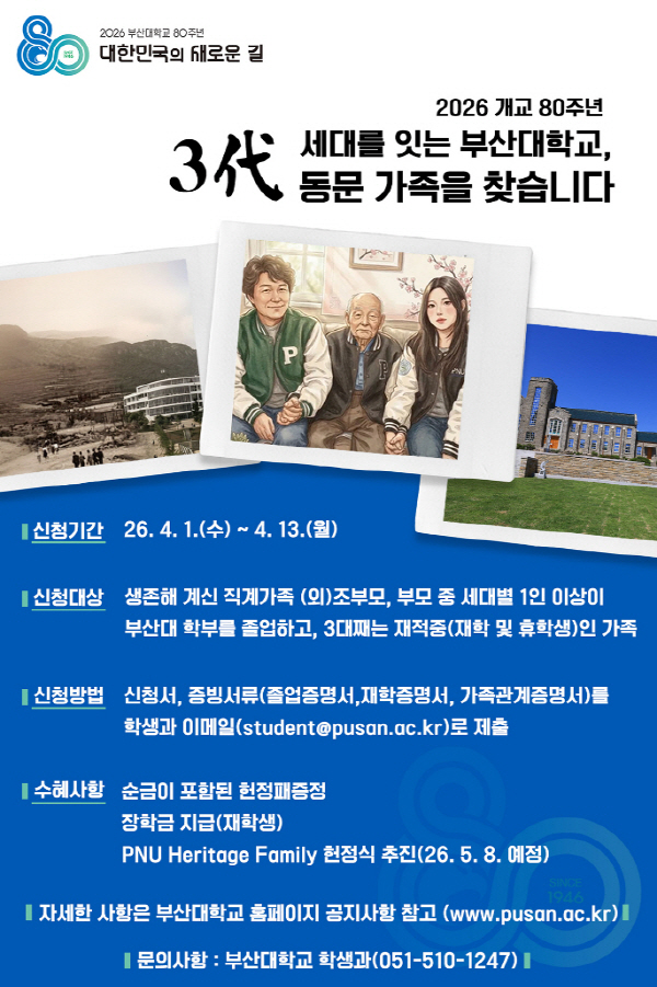 ºÎ»ê´ëÇб³(ÃÑÀå ÃÖÀç¿ø) Çлýó´Â °³±³ 80Áֳ⠱â³ä»ç¾÷ÀÇ ÀÏȯÀ¸·Î, ¡¸¼¼´ë¸¦ ÀÕ´Â ºÎ»ê´ë 3ÓÛ µ¿¹® °¡Á· ã±â¡¹(ºÎÁ¦: PNU Heritage Family)¸¦ ÅëÇØ (¿Ü)Á¶ºÎ¸ð, ºÎ¸ð, ÀÚ³à·Î À̾îÁö´Â 3´ë(ÓÛ)°¡ ¸ðµÎ ºÎ»ê´ë Çкο¡¼ ¼öÇÐÇÑ °¡Á·À» ¹ß±¼ÇÏ´Â »ç¾÷À» ÁøÇàÇÑ´Ù°í 25ÀÏ ¹àÇû´Ù.