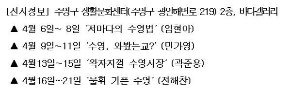 Àü½Ã´Â ¼ö¿µ±¸ »ýȰ¹®È¼¾ÅÍ(¼ö¿µ±¸ ±¤¾ÈÇØº¯·Î 219) 2Ãþ ¹Ù´Ù°¶·¯¸®¿¡¼ ÁøÇàµÇ¸ç, ´©±¸³ª ÀÚÀ¯·Ó°Ô °ü¶÷ÇÒ ¼ö ÀÖ´Ù.