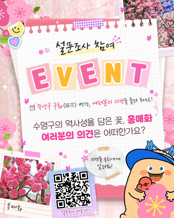 ¼ö¿µ±¸´Â ±¸È º¯°æ¿¡ ´ëÇÑ ÀÇ°ß ¼ö·ÅÀ» À§ÇØ 4¿ù 13ÀϺÎÅÍ 24ÀϱîÁö ¼³¹®Á¶»ç¸¦ ½Ç½ÃÇÑ´Ù. ¼ö¿µ±¸ īī¿ÀÅå ä³Î µî SNS¸¦ ÅëÇØ ÁøÇàµÇ¸ç, Á¶»ç °á°ú´Â ¾ÕÀ¸·Î Á¤Ã¥ °áÁ¤ÀÇ ±âÃÊÀÚ·á·Î Ȱ¿ëµÉ ¿¹Á¤ÀÌ´Ù.