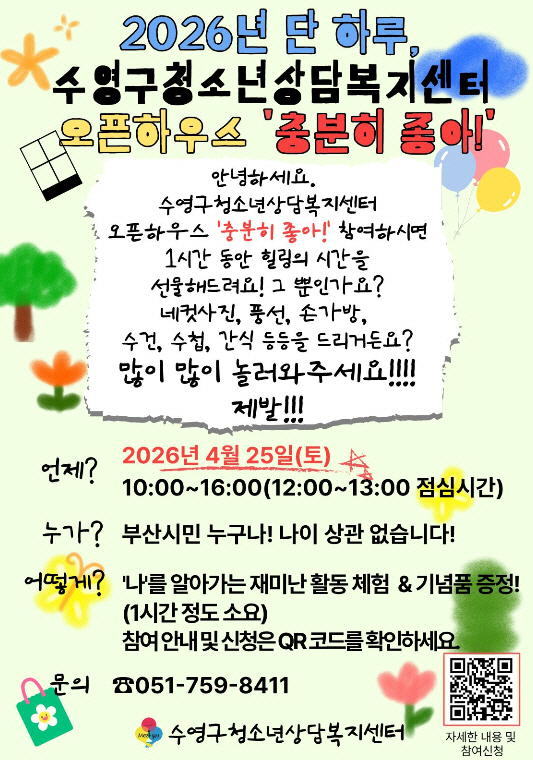 ºÎ»ê±¤¿ª½Ã ¼ö¿µ±¸(±¸Ã»Àå ±ÇÇÑ´ëÇà Á¤¿µ¶õ)´Â ¼ö¿µ±¸Ã»¼Ò³â»ó´ãº¹Áö¼¾ÅÍ(¼¾ÅÍÀå ŹÈñ¿í)¿¡¼ 4¿ù 25ÀÏ ÁøÇàÇÒ ¿ÀÇÂÇϿ콺 ¡¸ÃæºÐÈ÷ ÁÁ¾Æ!¡¹ÀÇ Âü¿©ÀÚ¸¦ 4¿ù 13ÀϺÎÅÍ 23ÀϱîÁö ¸ðÁýÇÑ´Ù°í ¹àÇû´Ù.