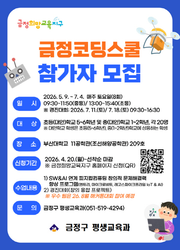 ºÎ»ê ±ÝÁ¤±¸´Â ÃÊ¡¤ÁßÇлýÀ» ´ë»óÀ¸·Î ÀΰøÁö´É(AI) ¹× ¼ÒÇÁÆ®¿þ¾î(SW) ±³À° ÇÁ·Î±×·¥ÀÎ ¡®2026 ±ÝÁ¤ ÄÚµù½ºÄð¡¯À» ¿î¿µÇÑ´Ù°í ¹àÇû´Ù.