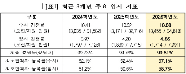 [Ç¥1] ÃÖ±Ù 3°³³â ÁÖ¿ä ÀԽà ÁöÇ¥ ±¸ºÐ2024Çг⵵2025Çг⵵2026Çг⵵¼ö½Ã °æÀï·ü(¸ðÁý/Áö¿ø Àοø)10.41(3,035 / 31,582)10.32(3,171 / 32,716)10.08(3,455 / 34,818)Á¤½Ã °æÀï·ü(¸ðÁý/Áö¿ø Àοø)3.97(1,797 / 7,126)4.20(1,839 / 7,715)4.66(1,714 / 7,991)ÃÖÁ¾ Ãæ¿øÀ²(Á¤¿ø³»)99.73%99.76%99.81%ÃÖÃÊÇÕ°ÝÀÚ µî·Ï·ü(¼ö½Ã)52.1%52.4%57.1%ÃÖÃÊÇÕ°ÝÀÚ µî·Ï·ü(Á¤½Ã)51.2%50.6%58.7%
