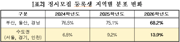 [Ç¥2] Á¤½Ã¸ðÁý µî·Ï»ý Áö¿ªº° ºÐÆ÷ º¯È ±¸ºÐ2024Çг⵵2025Çг⵵2026Çг⵵ºÎ»ê, ¿ï»ê, °æ³²76.5%75.1%68.2%¼öµµ±Ç(¼¿ï, °æ±â, ÀÎõ)6.5%9.2%13.9%