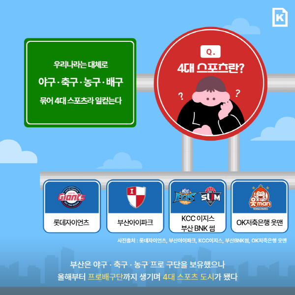 ºÎ»êÀÌ ¡®4´ë ÇÁ·Î ½ºÆ÷Ã÷ µµ½Ã¡¯ ¸¶Áö¸· ÆÛÁñÀ» ³¢¿ü´Ù. ³²ÀÚ ÇÁ·Î ¹è±¸ ¡®OKÀúÃàÀºÇà À¿¸Ç¡¯ÀÌ 2025~2026½ÃÁðºÎÅÍ ºÎ»ê¿¡ µÕÁö¸¦ ư´Ù. ÀÌ¿¡ µû¶ó ºÎ»êÀº ¾ß±¸(·Ôµ¥ ÀÚÀ̾ðÃ÷) Ã౸(ºÎ»ê ¾ÆÀÌÆÄÅ©) ³ó±¸(KCC ÀÌÁö½º, ºÎ»ê BNK ½æ)¿¡ ÀÌ¾î ¹è±¸±îÁö ǰÀ¸¸ç ºñ¼öµµ±Ç ÃÖÃÊ·Î 4´ë ÇÁ·Î ½ºÆ÷Ã÷ ±¸´ÜÀ» º¸À¯ÇÑ µµ½Ã°¡ µÆ´Ù.