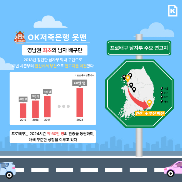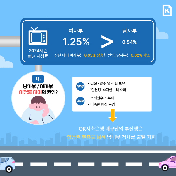 ÇÏÁö¸¸ ³²ÀÚ ¹è±¸´Â ºñ±³Àû °ü½ÉÀÌ ´úÇß´Ù. 2024~2025½ÃÁð V¸®±× ¿©ÀںΠÆò±Õ ½Ãû·üÀÌ 1.25%·Î »ó½Â¼¼¸¦ º¸ÀÎ °Í°ú ´Þ¸® ³²Àںδ 0.54%¿¡ ±×ÃÆ´Ù. ¿©Àںδ ±èõ°ú ±¤ÁÖ¸¦ ¿¬°í·Î ÇÏ´Â ÆÀÀÌ ÀÖ¾î ÆÒÃþÀÌ µÎ²®°í, ¡®¿©Á¦¡¯ ±è¿¬°æÀÌ Àα⸦ ÁÖµµÇß´Ù. ±×·¯³ª ³²Àںδ ´«¿¡ ¶ç´Â ¡®½ºÅ¸ ¼±¼ö¡¯°¡ ¾ø°í, ¿¬¸ÍÀÇ ÇàÁ¤ ¿î¿µÀÌ ¹Ì¼÷ÇØ ÆÒ½ÉÀ» ºÙÀâÁö ¸øÇÑ´Ù´Â ÁöÀûÀÌ ³ª¿Ô´Ù. ÀÌ ¶§¹®¿¡ »õ·Î¿î ½ÃÀå °³Ã´ÀÌ ÇÊ¿äÇÏ´Ù´Â ¸ñ¼Ò¸®°¡ ³ô¾Ò°í, À̹ø OKÀúÃàÀºÇàÀÇ ºÎ»ê ÀÌÀüÀÌ ¿µ³²±Ç ÆÒÀ» Èí¼öÇØ ³²³àºÎ °£ °ÝÂ÷¸¦ ÁÙÀÏ ±âȸ°¡ µÉ °ÍÀ̶ó´Â Æò°¡¸¦ ¹Þ´Â´Ù.