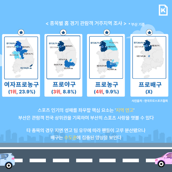 ¡®Áö¿ª ¿¬°í¡¯´Â ´ëÁß¼º°ú Á¢±Ù¼º Ãø¸é¿¡¼­ ÇÁ·Î ½ºÆ÷Ã÷ Àα⸦ Á¿ìÇÏ´Â ÇÙ½É ¿ä¼Ò´Ù. Çѱ¹ÇÁ·Î½ºÆ÷Ã÷Çùȸ ÀڷḦ º¸¸é Á¾¸ñº° ºÎ»ê °üÁß ºñÁßÀº ¢¹¿©ÀÚ ³ó±¸(23.9%) 1À§ ¢¹¾ß±¸(8.8%) 3À§ ¢¹³²ÀÚ ³ó±¸(9.9%) 4À§·Î Àü±¹ »óÀ§±ÇÀÌ´Ù. ºÎ»êÀÌ ÀüÅëÀû ¡®½ºÆ÷Ã÷ µµ½Ã¡¯ÀÓÀ» È®ÀÎÇÒ ¼ö ÀÖ´Ù.