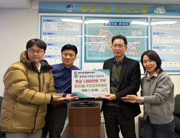 ºÎ»ê ¼ö¿µ±¸ ±¤¾È3µ¿ ÁÖ¹ÎÀÚÄ¡À§¿øÈ¸´Â Áö³­ 22ÀÏ ±¤¾È3µ¿ ÇàÁ¤º¹Áö¼¾ÅÍ¿¡ ¡®Èñ¸Á2026 ³ª´®Ä·ÆäÀΡ¯¼º±Ý 100¸¸ ¿øÀ» ±âºÎÇß´Ù. ¼º±ÝÀº Áö¿ª ³» Ãë¾à°èÃþ µî ¾î·Á¿î ÀÌ¿ôÀ» Áö¿øÇÏ´Â µ¥ »ç¿ëµÉ ¿¹Á¤ÀÌ´Ù.