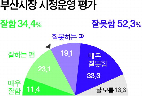 ±¹Á¦½Å¹®ÀÌ 6¡¤3 ºÎ»ê½ÃÀå ¼±°Å¸¦ ¾ÕµÎ°í ½Ç½ÃÇÑ ¿©·ÐÁ¶»çÀÇ Â÷±â ½ÃÀå ÀûÇÕµµ(´ÙÀÚ´ë°á)¿¡¼ ´õºÒ¾î¹ÎÁÖ´ç ÀüÀç¼ö(ºÏ°©) ÀÇ¿øÀÌ 30.8%ÀÇ ÁöÁö¸¦ ¾ò¾î 19.5%¿¡ ±×Ä£ ±¹¹ÎÀÇÈû ¹ÚÇüÁØ ºÎ»ê½ÃÀåÀ» 10%Æ÷ÀÎÆ® ÀÌ»ó ¾Õ¼¹´Ù. ¹Ú ½ÃÀåÀÇ ½ÃÁ¤ ¿î¿µ ºÎÁ¤ Æò°¡´Â 52.3%·Î °ú¹Ý¿¡ ´ÞÇØ, ¡®½ÉÆÇ·Ð¡¯ÀÌ Â÷±â ½ÃÀå ¼±È£µµ¿¡ ¿µÇâÀ» ¹ÌÄ£ °ÍÀ¸·Î Ç®À̵ȴÙ.