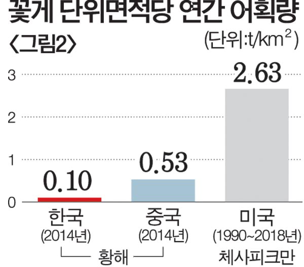 ±×·¸´Ù¸é Çѱ¹º¸´Ù 10¹è ÀÌ»ó ¸¹ÀÌ Àâ´Â Áß±¹ ¶§¹®¿¡ ³²È¹À¸·Î È²ÇØ¿¡¼ °ð ²É°Ô ¾¾°¡ ¸¶¸¦±î? Çѱ¹°ú Áß±¹ ¸ðµÎ ²É°Ô ¼ö»êÀÚ¿øÀ» Á¦´ë·Î Æò°¡ÇÏÁö ¸øÇϱ⠶§¹®¿¡ ÀÌ ¹°À½¿¡ ´äÇϱâ´Â ÈûµéÁö¸¸, È²ÇØ¿Í »ýŰ谡 ºñ½ÁÇÏ°í ¿¬±¸°¡ ¸¹ÀÌ µÈ ¹Ì±¹ µ¿ºÎ ü»çÇÇÅ©¸¸ ¼ö»êƯ»ê¹° ´ë¼¾ç ²É°Ô(blue crab)¿Í ÇÑ ¹ø ºñ±³Çغ¸ÀÚ. ü»çÇÇÅ©¸¸ ¸éÀûÀº 1¸¸1601§´·Î È²ÇØÀÇ 1/33¹Û¿¡ ¾È µÇÁö¸¸, 1990~2018³â µ¿¾È ¿¬°£ Æò±Õ ¾îȹ·®Àº 3¸¸£ôÀ¸·Î È²ÇØÀÇ 1/3 ¼öÁØÀ̶ó ´ÜÀ§ ¸éÀû´ç ¾îȹ·®Àº ¿ÀÈ÷·Á 10¹è°¡·® ´õ ¸¹´Ù <±×¸² 2>. ´ÜÀ§ ¸éÀû´ç ²É°Ô ¾îȹ·®Àº Çѱ¹ÀÌ °¡Àå Àû°í, ±× ´ÙÀ½ÀÌ Áß±¹À̸ç, ü»çÇÇÅ©¸¸Àº Áß±¹º¸´Ù 5¹è°¡·® ´õ ¸¹´Ù. ±×·±µ¥µµ Çѱ¹¸¸ ³²È¹ÀÌ ¹®Á¦¶ó¸é¼ ²É°Ô TAC¸¦ ½ÃÀÛÇß´Ù.ü»çÇÇÅ©¸¸¿¡¼´Â ³²È¹ÀÌ ÀϾ°í ÀÖ´Ù°í Æò°¡ÇÒ±î? °Ü¿ïÀáÀ» ÀÚ´Â ¼öÄÆ ²É°Ô¸¦ °¥°í¸® ±×¹°(Çü¸Á)·Î äÁýÇØ Æò°¡ÇÑ °á°ú ü»çÇÇÅ©¸¸ ²É°Ô °³Ã¼¼ö´Â 2020³â ±âÁØ ¾à 4¾ï500¸¸ ¸¶¸®·Î Ãß»êÇϰí ÀÖ´Ù. ü»çÇÇÅ©¸¸¿¡¼µµ Áö³ 30³â µ¿¾È TAC¸¦ ½Ç½ÃÇÒÁö ¿©ºÎ¸¦ °ËÅäÇØ¿ÔÁö¸¸, 2008³â ÀÌÈÄ °è¼ÓÇØ¼ ±ÇÀå ¾îȹ »ç¸Á·üÀÎ 34% ÀÌÇϸ¦ Àâ¾Æ ¿À°í ÀÖ´Ù°í Æò°¡ÇØ ¾ÆÁ÷ µµÀÔÇÏÁö ¾Ê¾Ò´Ù. 2019³â ¾îȹ»ç¸Á·üÀº 17%¿¡ Áö³ªÁö ¾Ê¾Ò´Ù.