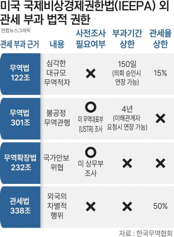 22ÀÏ °ü°èºÎó¿¡ µû¸£¸é Æ®·³ÇÁ ÇàÁ¤ºÎ´Â Áö³ÇØ 4¿ù 2ÀÏ ±¹Á¦ºñ»ó°æÁ¦±ÇÇѹý(IEEPA)À» ±Ù°Å·Î Àü¼¼°è ¹«¿ª »ó´ë±¹¿¡ ±¹°¡º° »óÈ£°ü¼¼¸¦ ¹ßÇ¥ÇÏ¸é¼ Çѱ¹¿¡ 25%(ÀÌÇÏ °ü¼¼À²)ÀÇ °ü¼¼¸¦ ¸Å±â±â ½ÃÀÛÇß´Ù. °°Àº ÇØ 4¿ù 3ÀϺÎÅÍ´Â ¼öÀÔ»ê ÀÚµ¿Â÷¿¡ 25%, 5¿ù 3ÀϺÎÅÍ´Â ÀÚµ¿Â÷ºÎǰ¿¡ 25%ÀÇ Ç°¸ñ°ü¼¼¸¦ ºÎ°úÇß´Ù.