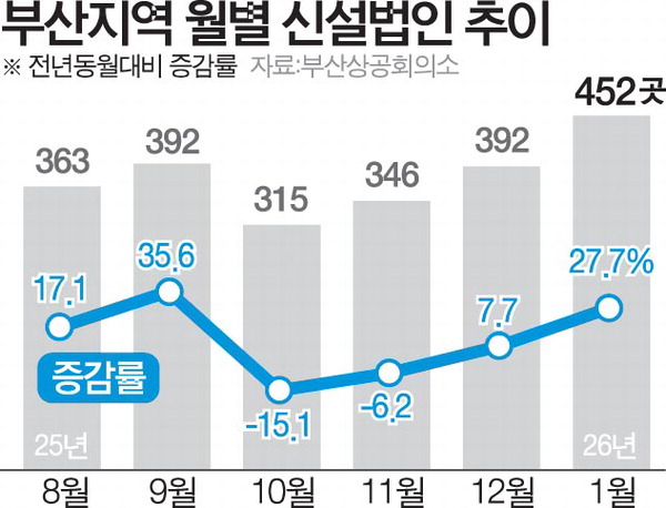 11ÀÏ ºÎ»ê»ó°øÈ¸ÀǼҴ ¡®2026³â 1¿ù ºÎ»êÁö¿ª ½Å¼³¹ýÀÎ ÇöȲ Á¶»ç¡¯ °á°ú¸¦ ¹ßÇ¥Çß´Ù. Á¶»ç¿¡ µû¸£¸é ¿ÃÇØ 1¿ù ºÎ»ê ½Å¼³¹ýÀÎ ¼ö´Â 452°³·Î Àü³â °°Àº ±â°£ ´ëºñ 27.7% Áõ°¡Çß´Ù. ÀÌ´Â ÃÖ±Ù 1³â Áß ÀúÁ¡À» ±â·ÏÇÑ Áö³ÇØ 10¿ù(315°³) ÀÌÈÄ 3°³¿ù ¿¬¼Ó Áõ°¡´Ù.¾÷Á¾º°·Î º¸¸é Á¤ºÎÀÇ AI Àü·« È®´ë¿Í ºÎ»êÇ×ÀÇ Ç׸¸¡¤¹°·ù AX(AI Àüȯ)¿¡ µû¶ó Á¤º¸Åë½Å¾÷ÀÌ Àü³â °°Àº ±â°£ ´ëºñ 73.9% ±ÞÁõÇß´Ù. °Ç¼³¾÷µµ °ø°øºÎ¹® ¼öÁÖ Áõ°¡¿Í Áö¿ª °Ç¼³»ç °ø»ç Âü¿© È®´ë ¹æÄ§ µîÀÇ ¿µÇâÀ¸·Î 70.8% ´Ã¾ú´Ù. ÀÌ¾î ¢¹ºÎµ¿»ê ¹× ÀåºñÀÓ´ë¾÷(57.1%) ¢¹Á¦Á¶¾÷(32.7%) ¢¹¼ºñ½º¾÷(23.1%) ¢¹¿î¼ö¾÷(18.8%) ¼øÀ¸·Î ½Å¼³¹ýÀÎ Áõ°¡À²ÀÌ ³ô¾Ò´Ù. À¯Åë¾÷ ½Å¼³¹ýÀÎÀº 114°³·Î Àü³â µ¿¿ù°ú °°¾Ò´Ù. Àüü ½Å¼³¹ýÀÎ Áß Â÷ÁöÇÏ´Â ºñÁßÀº À¯Åë¾÷(25.2%)ÀÌ °¡Àå ÄÇ´Ù. ±¸¡¤±ºº°·Î º¸¸é ºÎ»êÁø±¸(181.5%)¿Í Áß±¸(127.3%)°¡ Àü³â µ¿±â ´ëºñ ³ôÀº Áõ°¡À²À» º¸¿´´Ù. ºÎ»ê»óÀÇ´Â ÇØ¼öºÎ¿Í ÇØ¿î´ë±â¾÷ º»»ç ÀÌÀü È¿°ú µî¿¡ ÈûÀÔ¾î ¿øµµ½É »ýȰ±ÇÀÇ Ã¢¾÷½É¸®°¡ °³¼±µÇ°í ÀÖ´Â °ÍÀ¸·Î ºÐ¼®Çß´Ù.