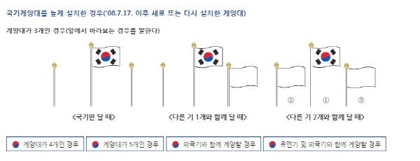 ¹Ý¸é, ÇöÃæÀÏ, ±¹Àå ±â°£, ±¹¹ÎÀåÀÏ ¹× Á¤ºÎÁöÁ¤ÀÏ µî Á¶ÀǸ¦ Ç¥ÇÏ´Â ³¯¿¡´Â ±êºÀ¿¡¼ ±ê¸éÀÇ ³Êºñ¸¸Å ³»·Á¼ ´Þ¾Æ¾ß ÇÑ´Ù.ÅÂ±Ø±â °Ô¾ç ½Ã°£Àº ¿ÀÀü 7½ÃºÎÅÍ ¿ÀÈÄ 6½Ã±îÁö´Ù. ´Üµ¶(°øµ¿) ÁÖÅÃÀÇ °æ¿ì¿¡´Â űر⸦ ´ë¹®ÀÇ Áß¾ÓÀ̳ª ¿ÞÂÊ¿¡, ´Ù¼¼´ë ÁÖÅÃÀ̳ª ¾ÆÆÄÆ®ÀÎ °æ¿ì¿¡´Â º£¶õ´ÙÀÇ Áß¾Ó ¶Ç´Â ¿ÞÂÊ¿¡ ´Ü´Ù.