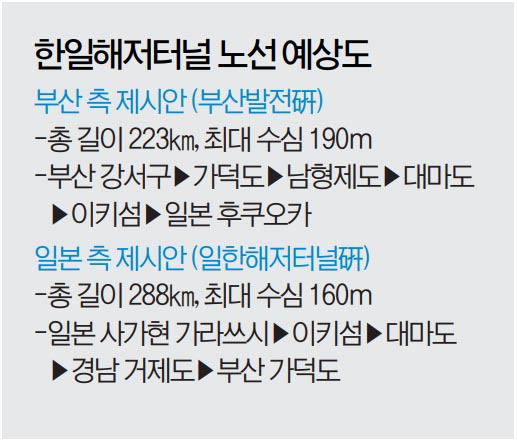 ÇÑÀÏÇØÀúÅͳΠÃßÁøÀÌ ³íÀÇµÈ ±â°£¸¸ÅÀ̳ª ±â¼úÀûÀÎ ÁöÇü ¹× ÁöÁúÁ¶»çµµ ¿À·£ ±â°£ À̾îÁ³´Ù. Çѱ¹ ÃøÀÎ ºÎ»ê¹ßÀü¿¬±¸¿øÀÌ Á¦¾ÈÇÑ ÇÑÀÏÇØÀúÅͳΠ³ë¼±Àº ºÎ»ê °¼±¸-°¡´öµµ-³²ÇüÁ¦µµ-´ë¸¶µµ-ÀÌŰ¼¶-ÀϺ» ÈÄÄí¿ÀÄ«¸¦ ¿¬°áÇÏ´Â ÃÑ ±æÀÌ 223§° ¾ÈÀÌ´Ù. ÀÌ ³ë¼±Àº ÃÖ´ë ¼ö½ÉÀÌ 190m¿¡ ÇØÀú ±¸°£°ú À°»ó ±¸°£ÀÌ °¢°¢ 147§°, 76§°´Ù. °Ç¼³ ±â°£Àº 10³â, °Ç¼³ºñ´Â ¾à 92Á¶ ¿øÀÌ ÅõÀ﵃ °ÍÀ¸·Î ¿¹»óµÈ´Ù. ÀϺ» ÃøÀÎ ÀÏÇÑÇØÀúÅͳבּ¸È¸´Â ÀϺ» »ç°¡Çö °¡¶ó¾²½Ã-ÀÌŰ¼¶-´ë¸¶µµ-°æ³² °ÅÁ¦µµ-ºÎ»ê °¡´öµµ¸¦ ÀÕ´Â ÃÑ ±æÀÌ 288§° ³ë¼±À» Á¦¾ÈÇß´Ù. ÀÌ ³ë¼±Àº ÃÖ´ë ¼ö½ÉÀÌ 160m·Î, ÇØÀú ±¸°£°ú À°»ó ±¸°£ÀÌ °¢°¢ 128§°, 92§°´Ù. °Ç¼³ ±â°£Àº ÃÖ´ë 20³âÀÌ °É¸®°í, °Ç¼³ºñ´Â ¾à 100Á¶ ¿øÀÌ µé¾î°¥ °ÍÀ¸·Î Ãß»êµÈ´Ù.
