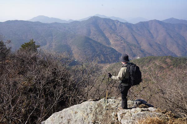 Á¤¸é¿¡ ³ôÀº »êÀº ±Ý¿À»êÀ̸ç, ½Ã°è¹Ý´ë¹æÇâÀ¸·Î õÅÂ»ê ¹«Ã´»ê Åä°î»ê°ú ½Å¼±ºÀ¿¡ dz·Â ¹ßÀü±â°¡ µ¹¾Æ°£´Ù. ±Ý¿À»ê ¿À¸¥ÂÊÀº ±¸Ãµ»ê ¸¸¾î»ê õÁöºÀ µî ±èÇØ ¾ç»ê ¹Ð¾çÀÇ »êÀÌ ÆîÃÄÁö¸ç ¹ß¾Æ·¡ ³¯¸Ó¸®ÀÎ ¾î¿µ¸¶À»ÀÌ »ê¼Ó¿¡ ÆÄ¹¯Çô ¿ÜºÎ¿Í ´ÜÀýµÈ ¸ð½ÀÀ» Çϰí ÀÖ´Ù. 2, 3£í ³ôÀÌ Àýº®¿¡ ¹åÁÙÀÌ ¹¿© ÀÖÀ¸³ª ³°¾Æ Áß°£¿¡ ²÷¾îÁ® ÀÖ´Ù. ¿À¸¥ÂÊ Âü³ª¹«¸¦ ºÙÀâ°í ¹ÙÀ§¸¦ ³»·Á¼±´Ù. ¼Ò³ª¹« ÇÑ ±×·ç°¡ Ç㸮°¡ ²ª¿© ºÐÀç °°Àº ¸ð½ÀÀ» ÇÑ ¹ÙÀ§ Àü¸Á´ë ÇÑ °÷À» ´õ °ÅÃÄ ³«¿±ÀÌ ±íÀº µ¥´Â Çã¹÷Áö±îÁö ºüÁö´Â ¶Ñ·ÇÇÑ ±æÀ» µû¶ó 770ºÀ¿¡¼ 40ºÐ ³²ÁþÀ̸é ÀÓµµ¿Í ¸¸³´Ù.