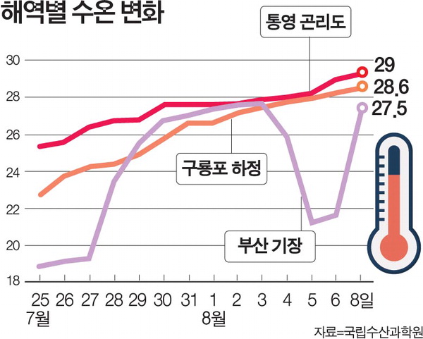 À̳¯ ¿ÀÀü ±âÀå ¾Õ¹Ù´ÙÀÇ ¼ö¿ÂÀº 27.5µµ·Î ¾ç½Ä ¾î·ùµéÀÇ Æó»ç°¡ º»°Ý ½ÃÀ۵Ǵ ¼ö¿Â 28µµ¿¡ ±ÙÁ¢Çß´Ù. ±âÀå ¾Õ¹Ù´Ù¿¡¼ ¹Ù´å¹°À» ²ø¾î ¾²´Â À°»ó ¾ç½ÄÀåÀº 12°÷À¸·Î ³ÒÄ¡, °µµ´Ù¸®, Àüº¹ µî 120¸¸ ¸¶¸®¸¦ Ű¿ì°í ÀÖ´Ù.