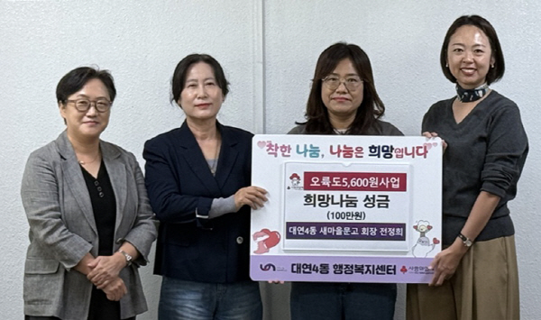 ºÎ»ê ³²±¸ ´ë¿¬4µ¿ »õ¸¶À»¹®°í(ȸÀå ÀüÁ¤Èñ)´Â Áö³ 10¿ù 24ÀÏ, ´ë¿¬4µ¿ÇàÁ¤º¹Áö¼¾ÅÍ¿¡ ¼º±Ý 100¸¸ ¿øÀ» Àü´ÞÇß´Ù.