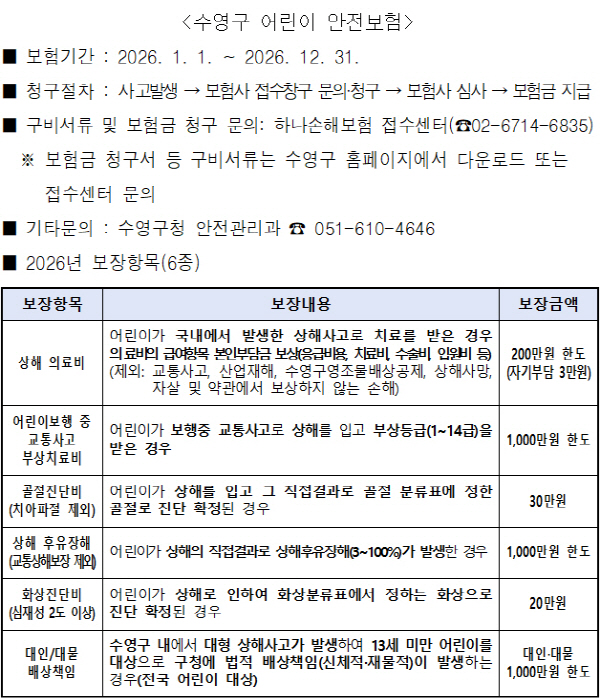 ¼ö¿µ±¸, Àü±¹ ¾îµð¼­³ª 6°³ Ç׸ñ ¾î¸°ÀÌ »ýȰ¾ÈÀü»ç°í ¹ß»ý ½Ã º¸Çè±Ý Áö±Þ