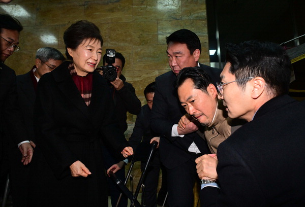 ¹Ú±ÙÇý Àü ´ëÅë·ÉÀÌ 22ÀÏ ±¹È¸ ·ÎÅÙ´õȦ¿¡¼­ 8Àϰ ´Ü½ÄÀ» À̾ ±¹¹ÎÀÇÈû À嵿Çõ ´ëÇ¥¸¦ À§·Î ¹æ¹®Çϰí ÀÖ´Ù. Àå ´ëÇ¥´Â ¹Ú Àü ´ëÅë·É°ú ´ëÈ­¸¦ ³ª´« µÚ ´Ü½ÄÀ» ³¡³»°í º´¿øÀ¸·Î À̵¿Çß´Ù. ±èÁ¤·Ï ±âÀÚ